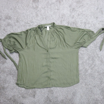 H&M Womens Button Front Blouse Tie Sleeves Silky Feel Sage Green Stripes US 8