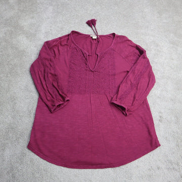 Lucky Brand Women Pullover Blouse Top Split V Neck Long Sleeve Maroon SZ Medium