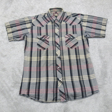 Wrangler Mens Plaid Button Up Western Shirt Short Sleeve Pockets Gray Black SZ L